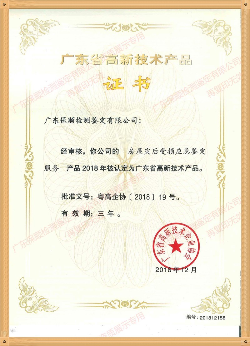 廣東省高新技術(shù)產(chǎn)品證書-房屋質(zhì)量鑒定服務(wù)