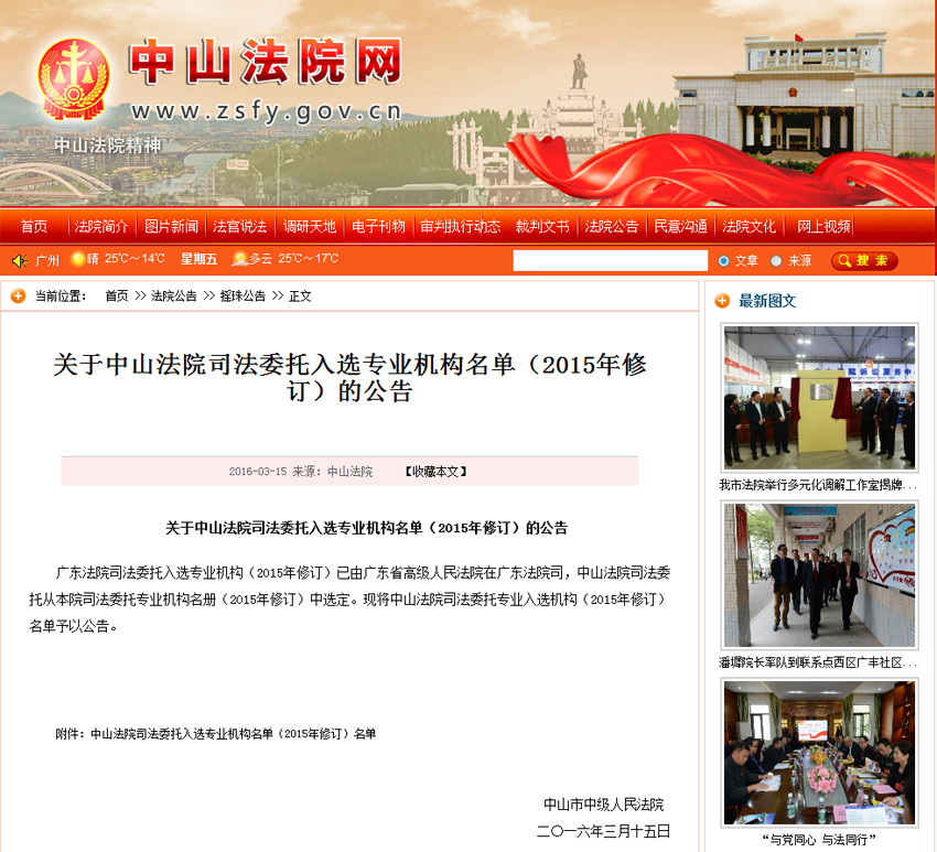 按照粵高法[2015]114號《廣東法院司法委托入選專業機構(2015年修訂)的基本條件》,經過法院審查核實,廣東保順檢測鑒定有限公司順利入選“中山中級法院”司法委托專業機構名錄。