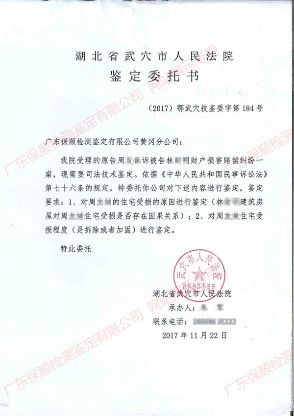 由湖北省武穴市人民法院審理的原告周**訴被告林**財產(chǎn)損害賠償糾紛一案,因案情需要,我司對林**建筑房屋與周**房屋受損是否存在因果關(guān)系和周**房屋受損程度(拆除或者加固)進行相關(guān)房屋檢測鑒定。