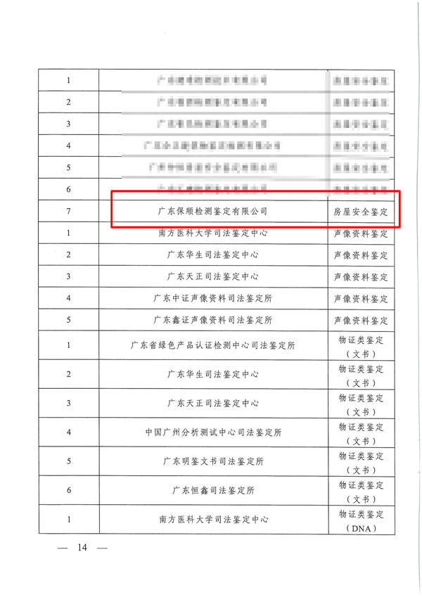 根據《廣東省高級人民法院關于印發(fā)<廣東法院2018年度司法委托專業(yè)機構增補名冊>的通知》(粵高法[2018]223號),廣東保順檢測鑒定有限公司入選廣州市中級人民法院司法鑒定機構名冊。代碼(搖珠號)為7,鑒定類別為:房屋安全鑒定。