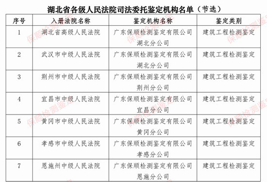 經湖北省高、中級法院審核,我司湖北分公司入選湖北省高級人民法院及各中院司法委托鑒定機構名單,自2018年1月1日起啟用,作為全省各級人民法院司法委托鑒定的備選機構。相關新聞:保順入選“湖北省高級人民法院”司法委托專業機構