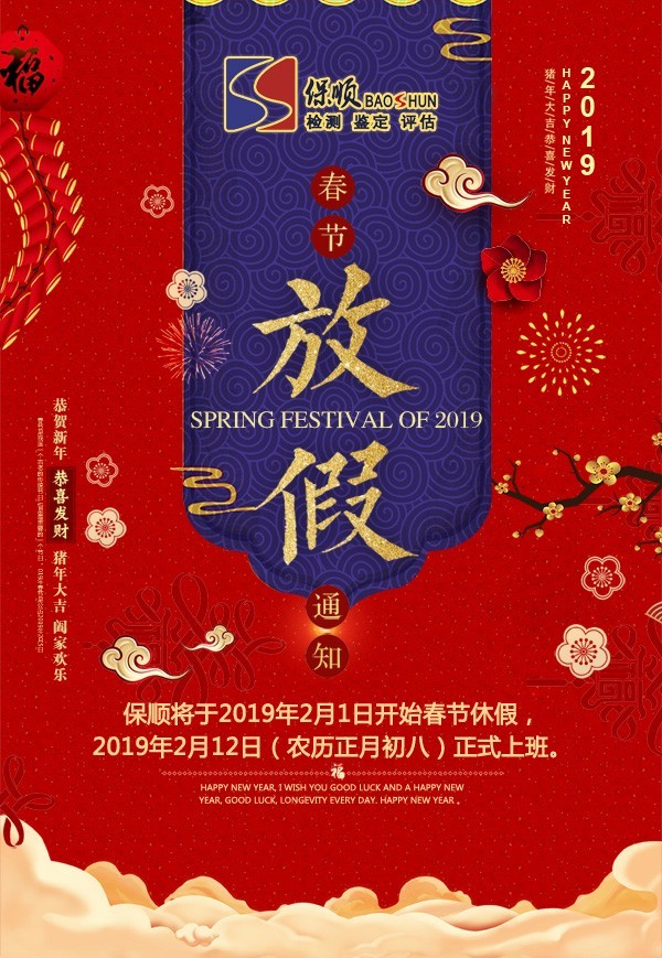 廣東保順檢測鑒定有限公司將于2019年2月1日開始春節(jié)休假,2019年2月12日(農(nóng)歷正月初八)正式上班。祝您假期愉快,2019年“豬”事順利!