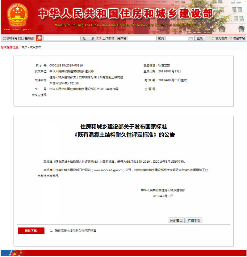 現(xiàn)批準(zhǔn)《既有混凝土結(jié)構(gòu)耐久性評定標(biāo)準(zhǔn)》為國家標(biāo)準(zhǔn),編號為GB/T51355-2019,自2019年8月1日起實(shí)施。