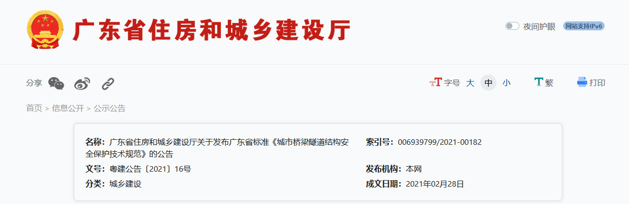 通知廣東省住房和城鄉建設廳關于發布廣東省標準《城市橋梁隧道結構安全保護技術規范》的公告