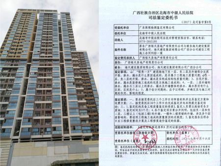 由廣西壯族自治區北海市中級人民法院審理的原告廣西**房地產有限責任公司與被告**建設集團有限公司、**建設集團有限公司廣西分公司建設工程施工合同糾紛一案,因案情需要,工程質量鑒定機構廣東保順檢測鑒定有限公司對位于北海市長青路*號的**建筑物地下負一層、負二層出現開裂、滲水、漏水是什么原因造成的,是否屬于工程施工質量問題;負一層、負二層的開裂、滲水、漏水是否構成結構性質量問題;三層以上的外墻鑒定范圍滲水、漏水及外墻整體的滲水、漏水的原因進行相關工程質量檢測鑒定。